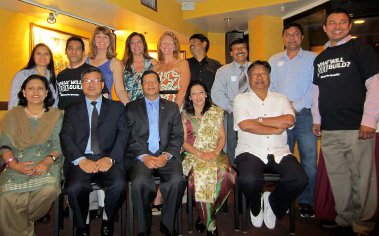 A dream come true! Supporting our fundraiser, The Ambassador Dr. Shankar Sharma and his wife seated in the bottom row, center, and to the left also seated the visiting Attorney General of Nepal Mr. Mukti Narayan Pradham and his wife. We are so grateful for their appearance and continued support! Our friends from Kathmandu Kichen standing are both showing off their “What will you build?” t-shirts!