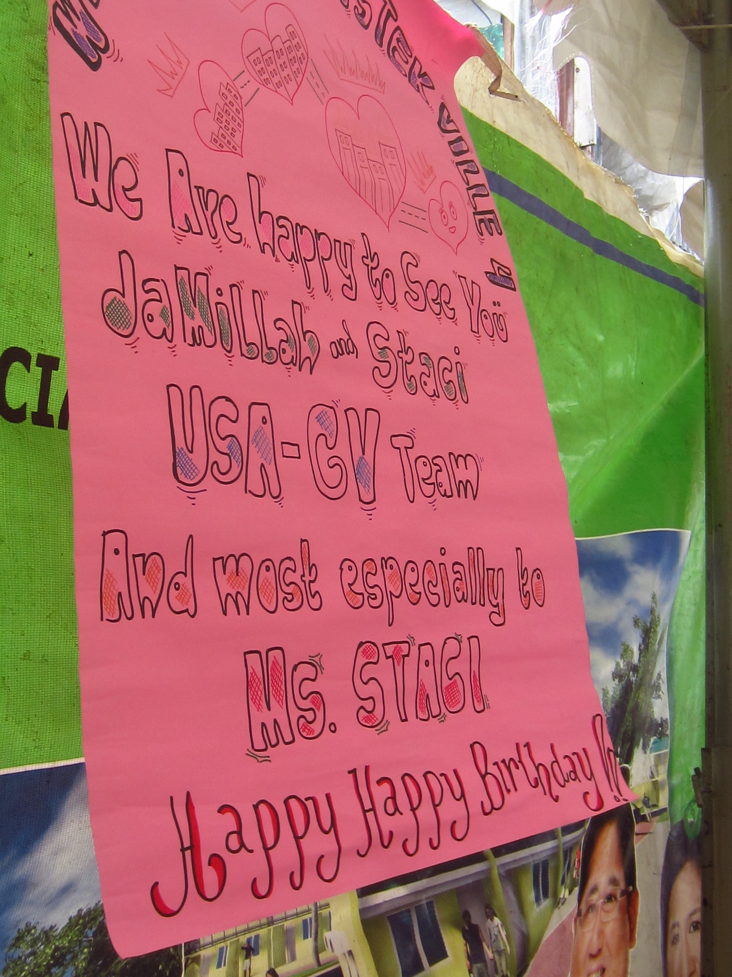 IMG_2505 Published at 3000 × 4000 in HFHI Global Village, Quezon City, Manila, Philippines – Arrival & Community Welcome « Previous Next » Welcome sign with “Happy Birthday Ms. Staci” message!