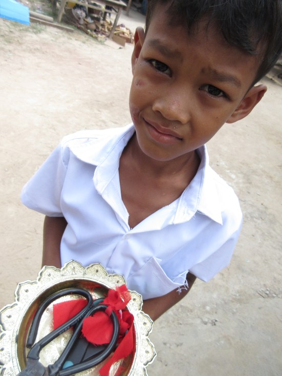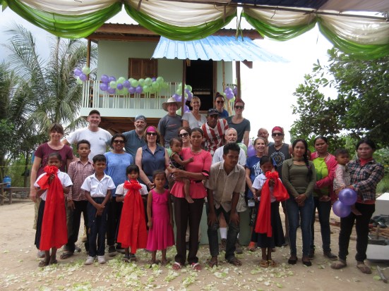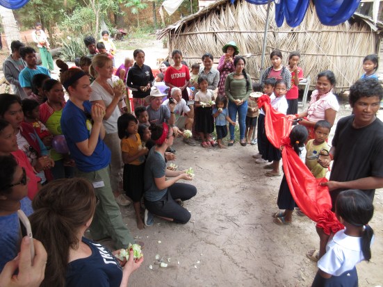 This is a special ceremony that marks the completion of the house in Cambodia. Everyone who helped, two by two, cuts a small section of the ribbon, until finally the homeowner makes the final cut and the ribbon drops and everyone showers them with lotus blossom petals! Afterward at the dedication ceremony everyone took turns expressing their feelings and deep appreciation for having been a part of this awesome and life changing experience.