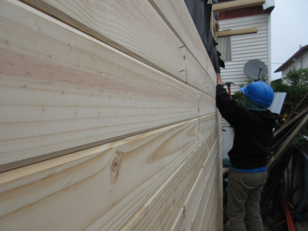 One crew continued to chip away at the siding, by the end of the day nearly finishing, including some complicated cuts around the window frames and the roofing.