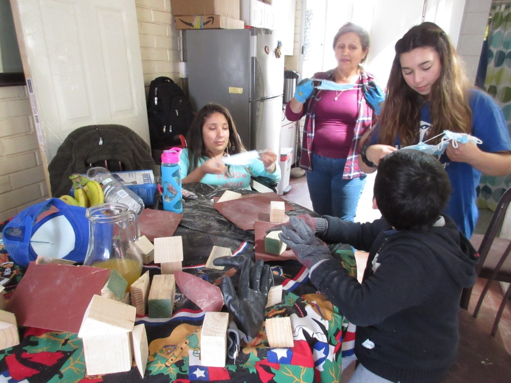 Claudia and David, Priscilla, our architect intern’s 8 year old son, had fun creating small wooden houses out of our left over cut pieces of wood.