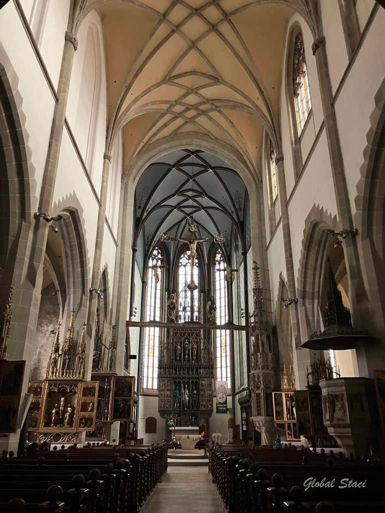 The Basilica of St. James is a Gothic catholic church in Levoča, Prešovský kraj, Slovakia. Building began in the 14th century. The interior features several Gothic altars, including the main altar, the world’s tallest wooden altar at 18.62 meters.