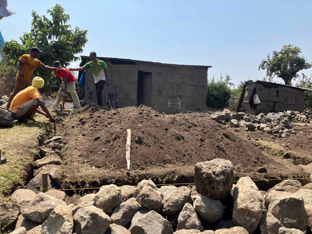 This is the first time in all of my years of building houses that we began the first day from ground zero. Meaning there was not even a string line on the ground to determine where the house would be placed until after we arrived! The village chief and some other dignitaries determined on the spot where the house would be placed on the property. Once the lines were set it was time to get digging in the hard, rocky earth.